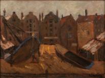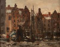 Marie Henri Mackenzie (1878-1961), stadsgezicht met pakhuizen en figuren, olieverf op paneel, gesigneerd, 32 x 40,5 cm