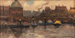Marie Henri Mackenzie (1878-1961), stoombootjes bij de koepelkerk te Amsterdam, olieverf op board, gesigneerd, 15 x 29 cm