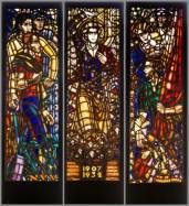 Willem Albertus van der Walle (1906-1995), serie van drie gebrandschilderde glas-in-loodramen: links drie mannelijke figuren en inscriptie 'N.V.V.'; midden vrouwelijke figuur en inscriptie 'Nederl. Vereeniging van Fabrieksarbeiders - 1907-1932 - van haar leden. Ontwerp W.A. v/d Walle - uitvoering Atelier De Vonk, Schrier & De Ru, Haarlem'; rechts man, vrouw, kind en figuur met vlag, en inscriptie 'N.V. De Arbeiderspers', in houten kaders, herkomst: Kunstcollectie FNV -enkele barstjes, volgrecht van toepassing-, 220 x 68 cm (per deel)