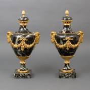 Paar groen marmeren siervazen met verguld bronzen ornamenten in de vorm van ramskoppen en guirlandes, Frankrijk, Louis Seize-stijl -één chip van basement-, 54 x 27 x 22 cm