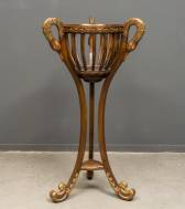 Hoge mahoniekleurige houten plantentafel met zwanenkoppen, deels verguld, 122 x Ø 61 cm