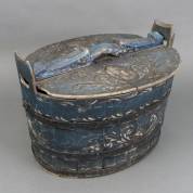 Blauwgeschilderde gekuipte houten Hindeloopen butte met grisailledecor, 19e eeuw -defecten-, waarschijnlijk werd alleen in blauwe kleuren geschilderd tijdens de rouw, 39 x 55 x 43 cm