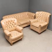 Driezits bank en twee fauteuils, alle met beige gecapitonneerde lederen bekleding, Chesterfield-stijl, 77 x 210 x 91 cm