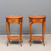 Paar niervormige rozenhoutgefineerde tafeltjes met bronzen beslag en bloemvormig inlegwerk in veld van parqueterie, 20e eeuw, 69 x 42 x 32 cm