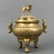 Groot messing wierookvat op pootjes, het deksel bekroond door qilin, het vat voorzien van inscriptie en zegelmerk, China, 19e eeuw -deksel licht gedeukt-, 40 x Ø 27 cm