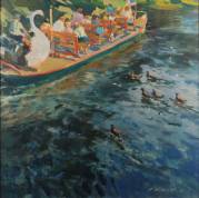 Charles Movalli (1945-2016), zwanenboot in Boston Public Garden, olieverf op doek, gesigneerd -bijgevoegd: beknopte biografie door Judi Rottenberg Gallery, Boston-, 90 x 90 cm