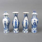 Vierdelig Chinees porseleinen kaststel met blauw-wit decor van lange lijzen, Kangxi gemerkt, 19e eeuw -randschilfers-, 22 cm