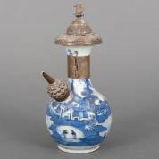 Chinees porseleinen ghendi met blauw-wit decor: figuren en bergdorp, voorzien van BWZG monturen, 19e eeuw -chip met bijbehorende barst-, 29 x Ø 13 cm