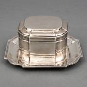 1e gehalte zilveren koektrommel op onderschotel, gecontourneerd en geprofileerd model, de trommel met scharnierend deksel, winkeliersmerk: D.J. Aubert & Zonen, 's-Gravenhage, vanaf 1958, brutogewicht 674 gram, 8 x 11,5 x 11,5 cm