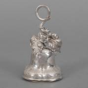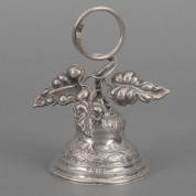 1e gehalte zilveren tafelbel gedecoreerd met bladeren en geciseleerd bladdecor en koperen binnenbel, onduidelijk meesterteken, 1866, brutogewicht 218 gram, 16 x 13 x 9,5 cm