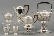 Uitgebreid schuitvormig en gecanneleerd 1e gehalte zilveren theeservies met houten grepen, bestaande uit: bouilloire, koffiekan, kleine theepot, komfoor, suikerpot, roomkan, lepelvaasje, alle meester: J. Blinxma & Co, Amsterdam, 1908, 1911, winkeliersmerk: Hoeker & Zoon, Amsterdam, brutogewicht 3313 gram -lichte gebruikssporen-