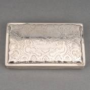 Rechthoekige 2e gehalte zilveren tabaksdoos, het deksel met gegraveerd dorpsgezicht en florale motieven, het interieur met houder, meester: Hermanus Jacobus van Halteren, Schoonhoven, 1837-1863, gewicht 149 gram, 2,75 x 13,5 x 8 cm