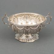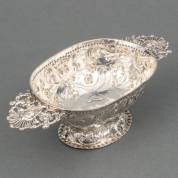 Ovale 1e gehalte zilveren brandewijnkom, met rijk gedreven decor van voluten en bloemen, de grepen ajourgezaagd en gedecoreerd met mascarons, putti en voluten, staand op standring, Sneek, 1735, gewicht 189 gram -restauraties-, 8 x 24 x 11 cm