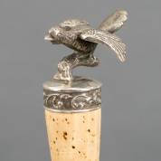 2e gehalte zilveren flessenstop, de rand gedecoreerd met geciseleerde voluten en bekroond met een vogel op een tak, brutogewicht 35,8 gram, 8 cm