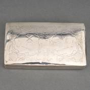 Rechthoekige 2e gehalte zilveren tabaksdoos, het deksel met gegraveerde dorpsgezichten en florale motieven, de binnenzijde van het deksel met gravering: 'Rients D Agema 1890', Nederland, 1858 -gravering sleets-, gewicht 126 gram, 2,75 x 13 x 7,5 cm