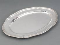 Ovaal gecontourneerd 2e gehalte zilveren dienblad, meester: M.H. Wilkens & Söhne, Bremen, winkeliersmerk: Schaap, Den Haag, gewicht 1119 gram, 49,5 x 33 cm