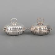 Paar 1e gehalte zilveren gelobde dekschalen met geprofileerde rand en voluutvormige greep, gewicht 1271 gram, 14 x Ø 20 cm