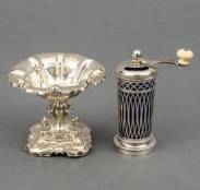 Gelobd 3e gehalte zilveren zoutschaaltje op voet -zoutschaal defect-, daarbij: 2e gehalte zilveren ajourgezaagde pepermolen met ivoren knopje en blauw glazen binnenbakje, 1900-1925 -werking moet nagekeken worden-, brutogewicht 168 gram, 9 cm