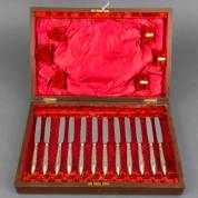 Twaalf messen met 2e gehalte zilveren heften, puntfilet, brutogewicht 576 gram, in mahonie cassette -cassette geschikt voor meer bestekdelen-, 20,5 cm