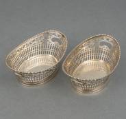 Paar 2e gehalte zilveren ajourgezaagde bonbonmandjes met parelrand, meester: Antoon Jan Pichal, Schoonhoven/Rotterdam, 1916, gewicht 192 gram, 5,5 x 13,5 x 8,75 cm