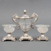 Kristallen en zilveren ménagèrestel, bestaande uit: twee zoutschaaltjes op rocaillegedecoreerde 3e gehalte zilveren voet -gelijmde chip-, en mosterdpot met 3e gehalte zilveren monturen en vermeil binnenzijde, brutogewicht 468 gram, 15 cm