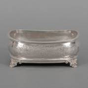 1e gehalte zilveren jardinière met geprofileerde rand en gegraveerd volutendecor, op vier gedecoreerde pootjes, meester: L.B. Wolff, 's-Gravenhage, 1857, gewicht 480 gram -gebruikssporen, staat niet recht-, 8 x 19 x 15 cm