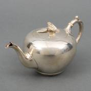 Bolvormige 2e gehalte zilveren theepot, met bloemgedecoreerde knop en voluutvormige greep, meester: J.M. van Kempen & Zonen, Voorschoten, 1861, brutogewicht 290 gram -speling in greep-, 11,5 x 22 x 12 cm
