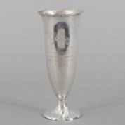 2e gehalte zilveren prijsbeker van Rotterdamsche Lloyd & Stoomvaart Maatschappij Nederland, gegraveerd: 'Wisselprijs voor tennis, aangeboden door de directie der S.M.N. 14-9-'30', meester: Begeer, Van Kempen & Vos, circa 1930 -voet verbogen-, gewicht 293 gram, 24,5 x Ø 10 cm