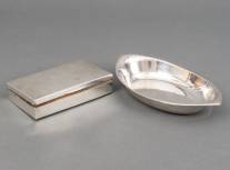 Ovaal 2e gehalte zilveren gehamerd schaaltje, Duitsland -inscriptie aan onderzijde-, en 1e gehalte zilveren sigarettendoos, Engeland -gedeukt-, brutogewicht: 415 gram, 3,5 x 21,75 x 12 cm