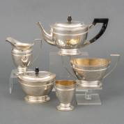 Vijfdelig 2e gehalte zilveren schuitvormig theeservies, empirestijl, bestaande uit: trekpotje met palissanderhouten greep en knop, roomkan, suikerschaal, lepelvaasje, en theebus met palissanderhouten knop, meester: J.M. van Kempen & Zonen, Voorschoten, 1911-1915, brutogewicht 1001 gram, 11 x 22 x 8 cm