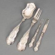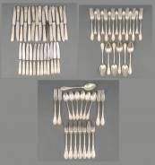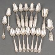 3e gehalte zilveren bestek met strikdecor, gemonogrammeerd: 'L', meester: Firma Krischer, Düsseldorf, bestaande uit: vijftien tafelvorken, vijftien tafelmessen met zilveren heften, zes tafellepels, elf dessertvorken, twaalf kleine messen met zilveren heften, zes toespijslepels en één dessertlepel, gewicht zonder de messen 2262 gram, brutogewicht messen 1921 gram, 24,5 cm