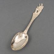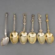 Zes deels vergulde zilveren gelegenheidslepels, deels voorzien van pseudokeuren, diverse gehaltes, alle 20e eeuw, gewicht 263 gram, 18,5 cm