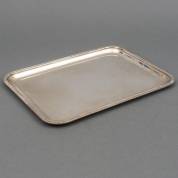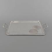 Rechthoekig 1e gehalte zilveren dienblad, met bladvormige grepen en geprofileerde rand met kruisbanden, Birmingham, 1953 -deuk-, gewicht 2016 gram, 56 x 35,5 cm