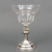 Geaccoleerde kristallen bokaal op 2e gehalte zilveren balustervormige voet, gedecoreerd met parelranden, brutogewicht 1176 gram -enkele randchipjes-, 26 x Ø 17 cm