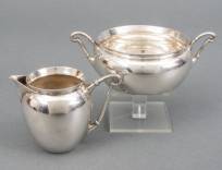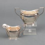 1e gehalte zilveren roomstel, bestaande uit: gelobde suikerpot en roomkan met geprofileerde grepen, meester: William Birmingham Ltd, 1981, gewicht 176 gram, 8,75 x 15 x 6 cm