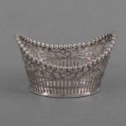 Klein model 1e gehalte zilveren ajourgezaagd bonbonmandje met parelrand, winkeliersmerk: Esmann Juweliers, Utrecht, 1975, gewicht 48 gram, 4,5 x 8 x 6 cm