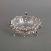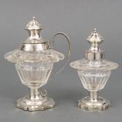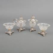 Vierdelige kristallen en 2e gehalte zilveren ménagèreset, bestaande uit: mosterdpot met lepel, strooibus, en paar zoutschaaltjes, alle staande op driepoot, meester: Jacobus Johannes Josephus Peeters, Rotterdam, 1841 -montuur mosterdpot zit los, zoutschaaltjes opnieuw gelijmd aan voet, enkele schilfertjes-, brutogewicht 704 gram