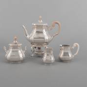 Vijfdelig 2e gehalte zilveren theeservies, kardinaalsmodel, bestaande uit: theepot met houten oor, komfoor -drie defecte ivoren bolpootjes bijgevoegd-, roomkan met ivoren oor, suikerpot, alle 1920, en lepelvaasje, 1919, meester: Fa. J.M. van Kempen & Zonen, Voorschoten, deels met winkeliersmerk S. Speyer, brutogewicht 1538 gram