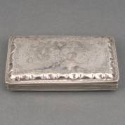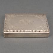 Rechthoekige 2e gehalte zilveren tabaksdoos, het deksel met gegraveerd bloemdecor, het interieur met houder en gravering: 'L.H. Tiesenga, 1867', meester: S.T. Reitsma, Sneek/Heerenveen, 1865, gewicht 136 gram, 3,25 x 13,5 x 7,25 cm