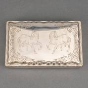 Rechthoekige 2e gehalte zilveren tabaksdoos, het deksel met gegraveerd decor van twee paarden, Nederland, 1973, gewicht 169 gram, 2,75 x 12,75 x 7,75 cm