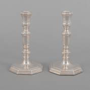 Paar 2e gehalte zilveren kandelaars op octagonale voet, winkeliersmerk: Koninklijke Van Kempen en Begeer, Zeist, brutogewicht 700 gram, 10 x 10 x 18,5 cm