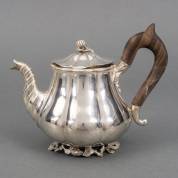 1e gehalte zilveren gelobde theepot met houten greep en deksel gedecoreerd met bloemknop, meester: F.G. Bentveld, Amsterdam, 1812-1853, winkeliersmerk: Bonebakker en Zoon, brutogewicht 439 gram -deksel en pootje verbogen-, 16 x Ø 12,5 cm