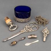 Divers 2e gehalte zilveren klein zilver: druivenschaar aan jasseronschakelcollier, chatelainehaak, flessenstop, zoutschaaltje, lepeltje, en geribde handwerkring, brutogewicht 278 gram