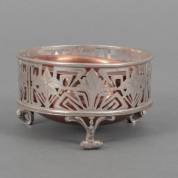 2e gehalte zilveren ajourgezaagd pijpkomfoortje, met art deco decor, op vier krulpootjes, en koperen binnenbakje, 1901, gewicht zilver 81 gram -enkele kleine defecten-, 5 x Ø 9,5 cm