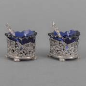 Ajourgezaagde 3e gehalte zilveren zoutschaaltjes met gecontourneerde blauw glazen binnenbakjes en 3e gehalte zilveren lepeltjes, brutogewicht 127 gram, 3,5 x 5 x 4,5 cm