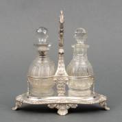 1e gehalte zilveren olie- en azijnhouder met twee kristallen karafjes -randchip-, meester: Edward, Edward jr., John & William Barnard, Londen, 1830, gewicht zonder karafjes 330 gram, 18,5 x 19 x 8,5 cm
