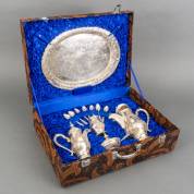 Djokja theeservies met gedreven bloemdecor, bestaande uit: theepot, melkkan, suikerpot met suikerschep, en lepelvaasje met zeven theelepels, op ovaal dienblad, gemerkt UD 800 Deluxe, gewicht 2568 gram, in batik koffer -tuitklepje theepot verbogen-, 24,5 cm