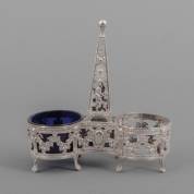 1e gehalte zilveren peper- en zoutstel met blauw glazen binnenbakje, het opstaande pilaarvormige handvat met ajourgezaagd decor van fauns, guirlandes en mascarons, Frankrijk, 19e eeuw -één blauw glazen binnenbakje ontbreekt-, brutogewicht 207 gram, 15 x 14,5 x 8 cm