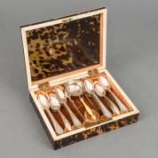 Schildpad doos, 19e eeuw, met twaalf 2e gehalte zilveren koffielepels, meester: W.H. Woortman, Amsterdam, 1875, zes 2e gehalte zilveren theelepels, meester S. Woortman, Amsterdam, 1829, 2e gehalte zilveren suikertang, en geprofileerde theezeef met benen greep, gewicht zilver 307 gram, brutogewicht theezeef 16 gram -defecten aan doos, sleuteltje ontbreekt-, 13,25 cm