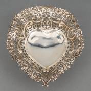 Hartvormige 1e gehalte zilveren broodmand, ajourgezaagde rand met decor van voluten en harten, meester: Walker & Hall, Sheffield, 1903, gewicht 466 gram, 9 x 29 x 25,5 cm
